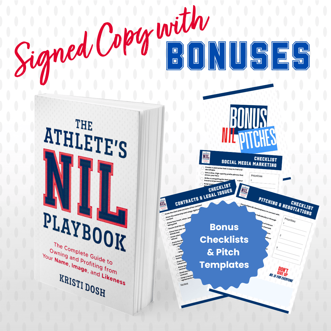 Get a signed copy of The Athlete's NIL Playbook along with 11 bonus pitch templates to help you land NIL deals and checklists to help you implement the strategies in the book.